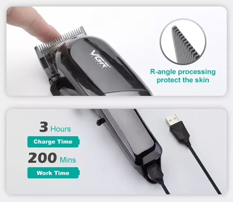 Barbería móvil sin ataduras: la VGR 118 viene recargable vía USB, pantalla LED para monitorear batería, motor potente y diseño elegante en negro que combina con tu estilo.